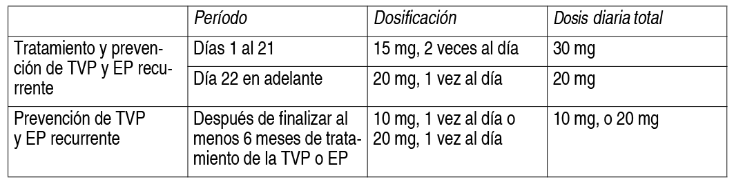 COMPOSICION: Cada comprimido recubierto contiene: Rivaroxabán 10.00 mg. Excipientes: Celulosa Microcristalina 49.50 mg, Lactosa Monohidrato 32.00 mg, Croscarmelosa Sódica 3.00 mg, Hidroxipropilmetilcelulosa 3.50 mg, Lauril Sulfato de Sodio 1.00 mg, Estearato de Magnesio 1.00 mg, Alcohol Polivinílico 2.00 mg, Dióxido de Titanio 1.25 mg, Talco 0.74 mg, Polietilenglicol 3000 1.01 mg. ACCION: Agente antitrombótico, inhibidor directo del factor Xa de la coagulación. Código ATC: B01AF01. INDICACIONES: Abaxon 10 está indicado para la prevención del Tromboembolismo Venoso (TEV) en pacientes sometidos a una intervención quirúrgica ortopédica mayor de las extremidades inferiores. Abaxon 10 está indicado para el tratamiento de la Trombosis Venosa Profunda (TVP) y de la Embolia Pulmonar (EP), y prevención de las recurrencias de la TVP y de la EP en adultos. DOSIS: Adultos: Prevención del TEV en adultos sometidos a cirugía electiva de reemplazo de cadera o rodilla: La dosis recomendada es de 1 comprimido recubierto de Abaxon de 10 mg, 1 vez al día. La duración del tratamiento depende del riesgo individual del paciente de presentar tromboembolismo venoso, que es determinado por el tipo de cirugía ortopédica. Después de la cirugía mayor de cadera, los pacientes deben recibir tratamiento durante 5 semanas. Después de la cirugía mayor de rodilla, los pacientes deben recibir tratamiento durante 2 semanas. Abaxon puede tomarse con o sin alimentos. La dosis inicial deberá administrarse de 6 a 10 horas después del final de la intervención quirúrgica, siempre que se haya restablecido la hemostasia. Si la dosis se omite, el paciente debe tomar Abaxon inmediatamente y continuar al día siguiente con la toma 1 vez al día, como antes. Tratamiento de la TVP, tratamiento de la EP y prevención de las recurrencias de la TVP y de la EP: La dosis recomendada para el tratamiento inicial de la TVP aguda o de la EP, es de 15 mg, 2 veces al día, durante las 3 primeras semanas, seguida de 20 mg, 1 vez al día, para el tratamiento continuado, así como para prevención de las recurrencias de la TVP y de la EP. Se debe considerar una duración corta del tratamiento (por lo menos 3 meses) en los pacientes con TVP o EP provocada por factores mayores de riesgo transitorio (es decir, cirugía mayor o traumatismo recientes). Se debe considerar una duración más prolongada del tratamiento en los pacientes con TVP o EP provocada, no relacionada con factores mayores de riesgo transitorio, TVP o EP no provocada o antecedentes de TVP o EP recurrente. Cuando está indicada la prevención extendida de la TVP o EP recurrente (después de finalizar por lo menos 6 meses de tratamiento de la TVP o la EP), la dosis recomendada es de 10 mg, 1 vez al día. Se debe considerar la administración de una dosis de rivaroxabán 20 mg, 1 vez al día, en los pacientes en los que se considera que el riesgo de TVP o EP recurrente es alto, por ejemplo, los que tienen comorbilidades complicadas o los que han presentado TVP o EP recurrente con la prevención extendida con Abaxon, 1 vez al día. La duración del tratamiento y la selección de la dosis deben individualizarse después de una valoración cuidadosa del beneficio del tratamiento frente al riesgo de hemorragia. Ver Tabla Forma de administración: Vía oral. Los comprimidos de Abaxon se pueden tomar con o sin los alimentos. Es posible triturar los comprimidos y mezclarlos con agua o los alimentos blandos (como puré de manzana), en aquellos pacientes con dificultad al tragar. El comprimido triturado de Abaxon se puede administrar por sonda nasogástrica. Se debe administrar el comprimido triturado en un pequeño volumen de agua por la sonda nasogástrica, irrigándola posteriormente con agua para su vaciado en el estómago. Olvido de dosis: Si el paciente olvida una dosis durante la fase de tratamiento de 15 mg, 2 veces al día (días 1 a 21), este deberá tomar inmediatamente Abaxon para garantizar una toma de 30 mg de rivaroxabán al día. En este caso, se pueden tomar dos comprimidos de 15 mg a la vez y al día siguiente se deberá seguir con la pauta habitual recomendada de 15 mg, 2 veces al día. Si el paciente olvida una dosis durante la fase de tratamiento de 1 vez al día, deberá tomar inmediatamente Abaxon y seguir al día siguiente con la pauta recomendada de 1 vez al día. La dosis no debe duplicarse en el mismo día para compensar una dosis olvidada. Información adicional: Pacientes con insuficiencia hepática: Rivaroxabán está contraindicado en los pacientes con enfermedad hepática asociada a una coagulopatía que lleva a un riesgo clínicamente relevante de hemorragia. No es necesario ningún ajuste de la dosis en los pacientes con otras enfermedades hepáticas. Los datos clínicos limitados en los pacientes con insuficiencia hepática moderada, indican un aumento significativo de la actividad farmacológica. No se dispone de datos clínicos en los pacientes con insuficiencia hepática grave. Pacientes con insuficiencia renal: Los limitados datos clínicos en los pacientes con insuficiencia renal grave indican que las concentraciones plasmáticas del rivaroxabán están aumentadas significativamente en esta población de pacientes. Por lo tanto, Abaxon debe emplearse con precaución en estos pacientes. El uso de Abaxon no se recomienda en pacientes con clearance de creatinina <15 ml/min. Para la prevención del TEV, en los pacientes adultos sometidos a cirugía electiva de reemplazo de cadera o rodilla, no es necesario un ajuste de la dosis en los pacientes con insuficiencia renal leve (clearance de creatinina de 50 a 80 ml/min) o insuficiencia renal moderada (clearance de creatinina de 30 a 49 ml/min). Para el tratamiento de la TVP y de la EP y la prevención de las recurrencias de la TVP y de la EP, no es necesario un ajuste de la dosis a partir de la dosis recomendada en los pacientes con insuficiencia renal leve (clearance de creatinina de 50 a