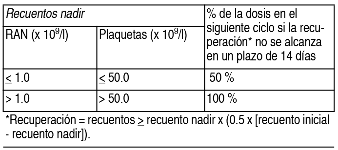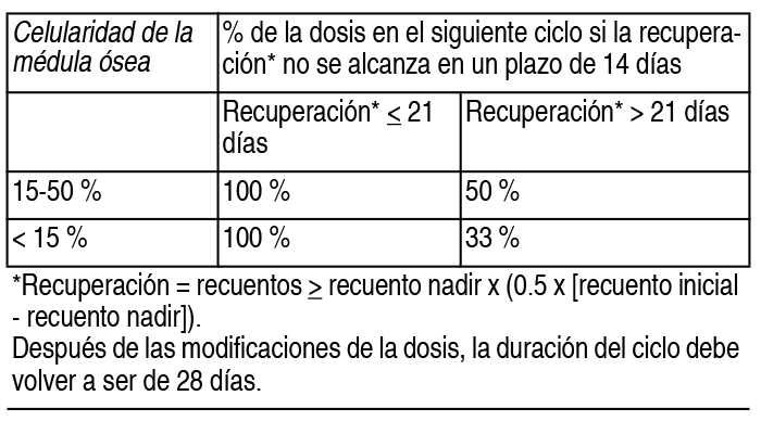 COMPOSICION: Cada vial contiene: Azacitidina 100 mg, Manitol 100 mg. ACCION: Antineoplásico. Código ATC: L01BC07. INDICACIONES: Azanova está indicado para el tratamiento de pacientes adultos que no se consideran candidatos a un trasplante de células madre hematopoyéticas (TCMH) y que padecen: Síndromes mielodisplásicos (SMD) intermedios 2 y de alto riesgo, según el sistema internacional de puntuación pronóstica (IPSS). Leucemia mielomonocítica crónica (LMMC) con entre 10 y 29 % de blastos medulares sin trastorno mieloproliferativo. Leucemia mieloide aguda (LMA) con entre 20 y 30 % de blastos y displasia multilínea, según la clasificación de la Organización Mundial de la Salud (OMS). LMA con >30 % de blastos medulares según la clasificación de la OMS. DOSIS: Primer ciclo de tratamiento: La dosis inicial recomendada para el primer ciclo de tratamiento, para todos los pacientes independientemente de los valores hematológicos iniciales, es de 75 mg/m2 por día, administrados por vía subcutánea o intravenosa, durante 7 días. Los pacientes deberán recibir medicación previa para prevenir náuseas y vómitos. Ciclos de tratamiento subsiguientes: Los ciclos deben repetirse cada 4 semanas. La dosis podrá incrementarse a 100 mg/m2 si no se observan efectos beneficiosos luego de 2 ciclos de tratamiento y si no han producido efectos tóxicos distintos que náuseas y vómitos. Se recomienda que los pacientes reciban como mínimo 6 ciclos de tratamiento. Sin embargo, las respuestas completas o parciales pueden requerir ciclos adicionales de tratamiento. El tratamiento se puede continuar siempre que el paciente se siga beneficiando. Deberán monitorearse la respuesta hematológica y la toxicidad renal del paciente y, si es necesario, retrasar o reducir la dosis según se describe a continuación. Análisis de laboratorio: Antes de iniciar el tratamiento y antes de cada ciclo de tratamiento, deben realizarse pruebas de función hepática y determinarse la creatinina sérica y el bicarbonato sérico. Deben efectuarse recuentos sanguíneos completos antes del inicio del tratamiento y cuando sea necesario para monitorizar la respuesta y la toxicidad, pero, como mínimo, antes de cada ciclo de tratamiento. Ajuste de la dosis debido a toxicidad hematológica: La toxicidad hematológica se define como el recuento sanguíneo más bajo alcanzado en un ciclo determinado (nadir), si el recuento de plaquetas es ≤ 50.0 x 109/l o el recuento absoluto de neutrófilos (RAN) es ≤ 1 x 109/l. La recuperación se define como un aumento de la/s línea/s celular/es en las que se observó una toxicidad hematológica, como mínimo, igual a la mitad de la diferencia entre el nadir y el recuento inicial, más el recuento nadir; es decir, recuento sanguíneo en la recuperación ≥recuento nadir+ (0.5 x [recuento inicial - recuento nadir]). Pacientes sin una disminución de los recuentos sanguíneos iniciales (es decir, leucocitos ≥3.0 x 109/l y RAN ≥1.5 x 109/l, y recuento plaquetario ≥75.0 x 109/l) antes del primer tratamiento: Si se observa toxicidad hematológica después del tratamiento con azacitidina, el siguiente ciclo de tratamiento debe retrasarse hasta que el recuento plaquetario y el RAN se hayan recuperado. Si la recuperación se alcanza en un plazo de 14 días, no es necesario un ajuste de la dosis. Sin embargo, si la recuperaci6n no se ha alcanzado en un plazo de 14 días, la dosis debe reducirse según la siguiente tabla. Después de las modificaciones de la dosis, la duración del ciclo debe volver a ser de 28 días. Ver Tabla Pacientes con recuentos sanguíneos iniciales reducidos (es decir, leucocitos < 3.0 x 109/l o RAN < 1.5 x 109/l o recuento plaquetario < 75.0 x 109/l) antes del primer tratamiento: Después del tratamiento con azacitidina, si la disminución del recuento leucocitario del RAN o del recuento plaquetario con respecto al recuento antes del tratamiento es ≤ 50 % o superior al 50 %, pero con una mejoría en la diferenciación de cualquier línea celular, el siguiente ciclo no debe retrasarse y no debe efectuarse ningún ajuste de la dosis. Si la disminución del recuento leucocitario del RAN o del recuento plaquetario es superior al 50 % con respecto al recuento antes del tratamiento, y no hay mejoría en la diferenciación de líneas celulares, el siguiente ciclo de tratamiento con azacitidina debe retrasarse hasta que el recuento plaquetario y el RAN se hayan recuperado. Si la recuperación se alcanza en un plazo de 14 días, no es necesario un ajuste de la dosis. Sin embargo, si la recuperación no se ha alcanzado en un plazo de 14 días, debe determinarse la celularidad de la médula ósea. Si la celularidad de la médula ósea es > 50 %, no debe efectuarse un ajuste de la dosis. Si la celularidad de la médula ósea es ≤ 50 %, el tratamiento debe retrasarse y la dosis debe disminuirse, según la siguiente tabla: Ver Tabla Ajuste de la dosis teniendo en cuenta la función renal y los electrolitos séricos: En caso de reducciones inexplicadas en los niveles de bicarbonato sérico a valores inferiores a 20 mEq/I, deberá reducirse la dosis un 50 % en el ciclo siguiente. Del mismo modo, si se producen aumentos inexplicados en el nitrógeno ureico en sangre o de la creatinina sérica, deberá postergarse el ciclo siguiente hasta alcanzar la normalización de los valores o los valores basales y deberá reducirse la dosis el 50 % en el siguiente ciclo de tratamiento. Administración en pacientes en edad avanzada: Se sabe que la azacitidina y sus metabolitos se excretan en gran medida por los riñones y el riesgo de que se produzcan de toxicidad en respuesta a este fármaco puede ser mayor en los pacientes con deterioro de la función renal. Dado que los pacientes de edad avanzada tienen una mayor probabilidad de presentar una reducción de la función renal, deberá seleccionarse la dosis con cuidado, y será útil realizar monitoreos de la función renal en d