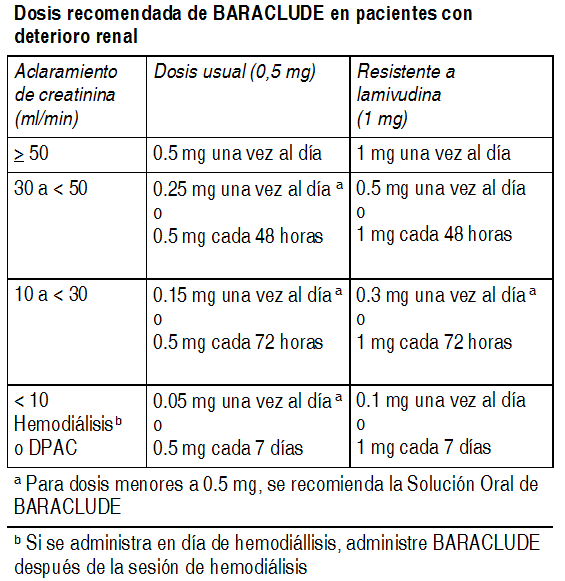 COMPOSICION: Comprimidos recubiertos 0.5 mg: Cada comprimido recubierto contiene: Entecavir (como Monohidrato) 0.5 mg. Comprimidos recubiertos 1 mg: Cada comprimido recubierto contiene: Entecavir (como monohidrato) 1 mg. Solución oral: Cada ml contiene: Entecavir (como monohidrato) 0.05 mg. ACCION: Análogo nucleósido inhibidor de la transcriptasa reversa activo frente al virus de la hepatitis B. INDICACIONES: Baraclude está indicado para el tratamiento de la infección crónica causada por el virus de la hepatitis B en adultos con evidencia de replicación viral activa o con evidencia de elevaciones persistentes en las aminotransferasas séricas (ALT o AST) o enfermedad histológicamente activa. Los siguientes puntos deben considerarse al iniciar el tratamiento con Baraclude: Esta indicación se basa en las respuestas histológicas, virológicas, bioquímicas y serológicas, en sujetos adultos sin tratamiento previo con nucleósidos y resistentes a lamivudina con infección crónica por VHB HBeAg positivo o HBeAg negativo con enfermedad hepática compensada. Están disponibles datos virológicos, bioquímicos y serológicos de un estudio controlado en sujetos adultos con infección crónica por VHB y enfermedad hepática descompensada. Están disponibles datos virológicos, bioquímicos y serológicos para un número limitado de sujetos adultos con coinfección por VIH/VHB que recibieron previamente tratamiento con lamivudina. DOSIS: Baraclude debe ser administrado con el estómago vacío (al menos 2 horas antes y 2 horas después de comer). Dosis recomendada: Enfermedad hepática compensada: La dosis recomendada de Baraclude para la infección crónica por el virus de la hepatitis B, en adultos y adolescentes mayores de 16 años sin tratamiento previo con nucleósidos, es de 0.5 mg 1 vez al día. La dosis recomendada de Baraclude en adultos y adolescentes, de por lo menos 16 años con historia de viremia de hepatitis B mientras reciben lamivudina o con mutaciones conocidas de resistencia a lamivudina o telbivudina en la posición rtM204I/V con o sin las posiciones rtL180M, rtL80I/V o rtV173L es de 1 mg 1 vez al día. Enfermedad hepática descompensada: La dosis recomendada de Baraclude para infección crónica por virus de hepatitis B en adultos con enfermedad hepática descompensada es de 1 mg 1 vez al día. La solución oral de Baraclude contiene 0.05 mg de entecavir por mililitro. Por lo tanto, 10 ml de la solución oral proveen una dosis de 0.5 mg y 20 ml proveen una dosis de 1 mg de entecavir. Deterioro renal: En sujetos con deterioro renal, el aclaramiento oral aparente de entecavir disminuyó cuando disminuyó el aclaramiento de creatinina. Se recomienda ajustar la dosis para pacientes con aclaramiento de creatinina < 50 ml/min, incluyendo pacientes en hemodiálisis o diálisis peritoneal ambulatoria continua (DPAC), como se muestra en la Tabla 1. Se prefieren los regímenes de dosis única diaria. Ver Tabla Deterioro hepático: No es necesario ajustar la dosis en pacientes con deterioro hepático. PRESENTACIONES: Baraclude® Comprimidos recubiertos: Envase conteniendo 30 comprimidos recubiertos. Baraclude® Solución oral: Frasco conteniendo 210 ml de solución. |