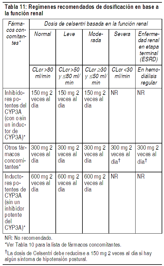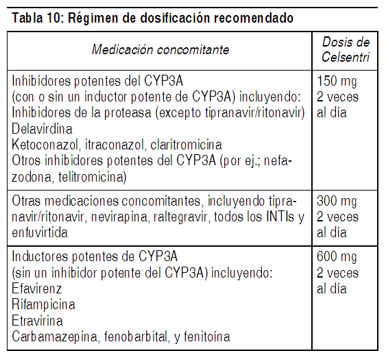 COMPOSICION: Celsentri 150 mg: Cada comprimido recubierto contiene: Maraviroc 150.00 mg. Excipientes: Celulosa Microcristalina 282.00 mg; Fosfato Acido de Calcio Anhidro 142.50 mg; Almidón Glicolato de Sodio 18.00 mg; Estearato de Magnesio 7.50 mg; Azul Opadry II (85G20583)* 24.00 mg. Calsentri 300 mg: Cada comprimido recubierto contiene: Maraviroc 300.00 mg. Excipientes: Celulosa Microcristalina 564.00 mg; Fosfato Acido de Calcio Anhidro 285.00 mg; Almidón Glicolato de Sodio 36.00 mg; Estearato de Magnesio 15.00 mg; Azul Opadry II (85G20583)* 48.00 mg. *Contiene Alcohol Polivinílico, Dióxido de Titanio, Polietilenglicol (Macrogol 3350), Talco, Lecitina de Soya, Indigo Carmín Laca Alumínica. ACCION: Maraviroc es un fármaco antiviral de uso sistémico. Código ATC: J05AX09. INDICACIONES: Celsentri, en combinación con otros medicamentos antirretrovirales, está indicado solamente en pacientes adultos infectados con VIH-1con tropismo CCR5. Esta indicación se basa en el análisis de los niveles plasmáticos de ARN de HIV-1 en dos estudios controlados de Celsentri en sujetos con experiencia de tratamiento, y un estudio en sujetos sin tratamiento previo. Ambos estudios en sujetos con experiencia de tratamiento se realizaron en adultos clínicamente avanzados, con experiencia de tratamiento con antirretrovirales de 3 clases [INTI (análogos nucleosídicos inhibidores de la transcriptasa reversa), INNTI (análogos no nucleosídicos inhibidores de la transcriptasa reversa), IP (inhibidores de la proteasa), o enfuvirtida], con evidencia de replicación de HIV-1 a pesar de la terapia antirretroviral en curso. Deben tenerse en cuenta los siguientes puntos al iniciar la terapia con Celsentri: Utilizar Celsentri sólo en pacientes adultos infectados con HIV-1 con tropismo CCR5. Las pruebas de tropismo deben llevarse a cabo con un ensayo de tropismo altamente sensible que haya demostrado la capacidad para identificar a los pacientes adecuados para el uso de Celsentri. La proliferación de HIV-1 con tropismo CXCR4 o con tropismo dual/mixto, con nivel bajo preexistente, que no se detectan mediante pruebas de tropismo en la selección, se han asociado con fracaso virológico con Celsentri. No se recomienda el uso de Celsentri en sujetos con HIV-1 con tropismo dual/mixto o tropismo CXCR4 dado que no se demostró su eficacia en un estudio de fase 2 de este grupo de pacientes. No se han establecido la seguridad y eficacia de Celsentri en pacientes pediátricos. En sujetos sin tratamiento previo, más pacientes tratados con Celsentri experimentaron fracaso virológico y desarrollaron resistencia a lamivudina en comparación con efavirenz. DOSIS: Recomendaciones de dosis para pacientes con función renal normal: La dosis recomendada de Celsentri difiere en base a la medicación concomitante, debido a las interacciones de fármacos (ver Tabla 10). Celsentri puede tomarse con o sin alimentos. Celsentri debe administrarse en combinación con otros medicamentos antirretrovirales. Ver Tabla Recomendaciones de dosis para pacientes con insuficiencia renal: La Tabla 11 proporciona recomendaciones de dosificación para pacientes en base a la función renal y la medicación concomitante. Ver Tabla PRESENTACIONES: Celsentri 150 y 300 mg: Envase conteniendo 60 comprimidos recubiertos. Información adicional podrá solicitarse a dirección médica de GlaxoSmithKline Argentina S.A. Tel.: (011) 4725-8900. |
