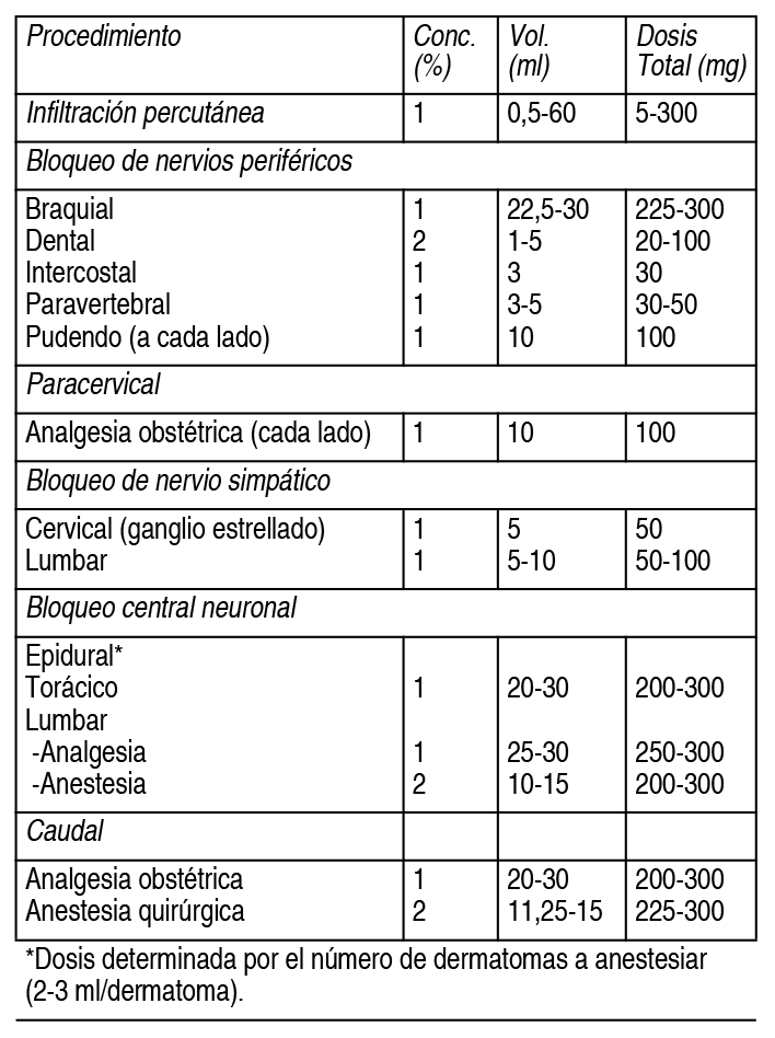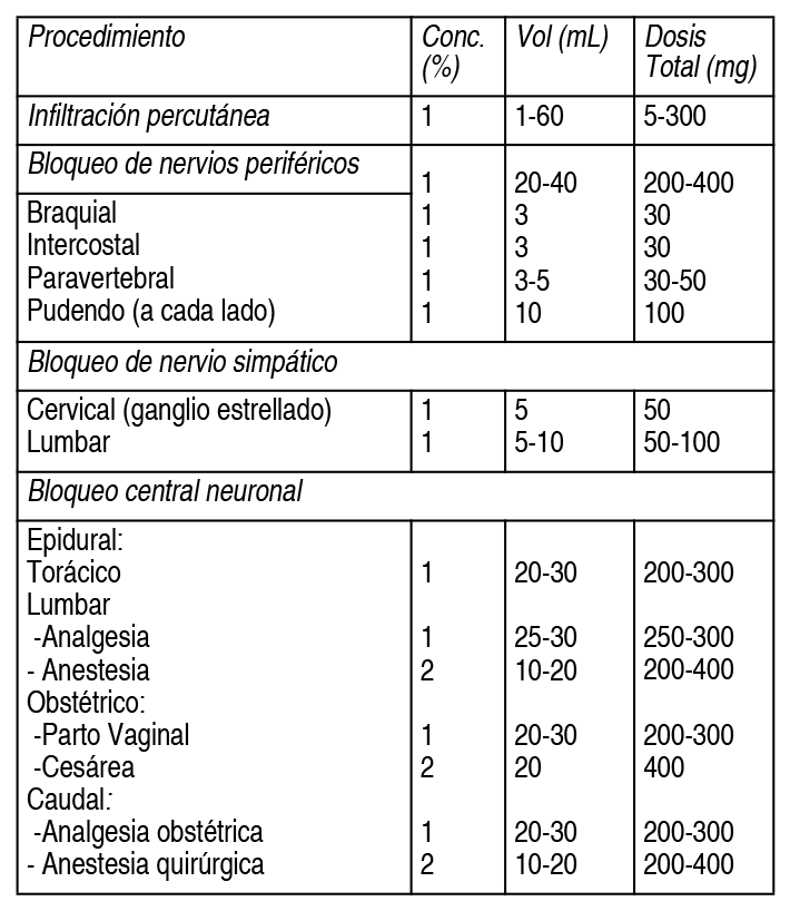 COMPOSICION: Spray tópico: Cada 100 ml contiene: Lidocaína Base 10 g. Inyectable IM/IV sin Epinefrina 1 g: Cada 100 ml contiene: Lidocaína Clorhidrato 1 g. Inyectable IM/IV sin Epinefrina 2 g: Cada 100 ml contiene: Lidocaína Clorhidrato 2 g. Inyectable IM/IV con Epinefrina 1 g / 0.5 mg: Cada 100 ml contiene: Lidocaína Clorhidrato 1 g, Epinefrina (como Epinefrina bitartrato) 0.5 mg. Inyectable IM/IV con Epinefrina 2 g / 0.5 mg: Cada 100 ml contiene: Lidocaína Clorhidrato 2 g, Epinefrina (como Epinefrina bitartrato) 0.5 mg. Solución viscosa tópica: Cada 100 ml de solución contiene: Lidocaína Clorhidrato 2 g. ACCION: Inyectable IM/IV con/sin Epinefrina: Anestésico local de acción moderadamente prolongada sin vasoconstrictor. Spray tópico: Anestésico tópico para mucosas y semimucosas. INDICACIONES: Inyectable IM/IV con/sin Epinefrina: Indicado en la producción de anestesia local o regional por técnicas de infiltración como inyección percutánea, por técnicas de bloqueo nervioso periférico como plexus braquial e intercostal y por técnicas neurales centrales como bloqueo epidural, lumbar y caudal. Solución viscosa tópica: Anestesia local tópica en membranas mucosas accesibles (endoscopia o exploración de esófago, laringe, boca, cavidad nasal, faringe, recto, tráquea y tracto urinario), tratamientos de trastornos de la cavidad oral (dolor por irritación, inflamación en lesiones de boca y encías, dolor por prótesis dental), tratamiento del dolor faríngeo. DOSIS: Spray tópico: Se debe emplear la dosis mínima efectiva. En pacientes debilitados, ancianos y niños la dosis se debe ajustar en relación a su edad y condición física. Cada activación de la válvula libera 10 mg de lidocaína base. Es innecesario secar el sitio antes de cada aplicación. No se debe usar más de 20 pulveraciones en adultos para lograr el efecto anestésico deseado. El número de pulveraciones depende de la extensión del área a anestesiar. Odontología: 1 - 5 aplicaciones sobre la membrana mucosa. Otorrinolaringología: 3 aplicaciones para punción del seno maxilar. Parto: Hasta 20 aplicaciones (200 mg de lidocaína base), en mucosa cervicovaginal. Introducción de instrumentos y catéteres en el tracto respiratorio: hasta 20 aplicaciones (200 mg de lidocaína base) para procedimientos de faringe, laringe y tráquea. Inyectable sin/con Epinefrina: Las dosis recomendadas sólo sirven como una guía para la cantidad de anestesia requerida para la mayoría de los procedimientos de rutina. Los volúmenes reales y las concentraciones a utilizar dependen de un número de factores tales como el tipo y la duración del procedimiento quirúrgico, la profundidad de la anestesia y el grado de relajación muscular requerida, la duración de la anestesia requerida, y la condición física del paciente. En todos los casos suministrar la dosis más baja que produce el efecto deseado. Las dosis deben reducirse en niños y ancianos o en pacientes debilitados y con deficiencia cardíaca y/o hepática. Inyectable IM/IV sin Epinefrina: Adultos: Se recomienda que la dosis máxima individual no exceda los 4.5 mg/kg y la dosis máxima total los 300 mg. Para anestesia epidural o caudal, la dosis máxima recomendada no debe ser administrada en intervalos menores a 90 minutos. La dosis máxima recomendada por período de 90 minutos de lidocaína HCl para bloqueo paracervical en pacientes obstétricos y no obstétricos es de 200 mg totales. La mitad administrada de cada lado, con un intervalo de 5 minutos. En anestesia epidural, la dosis varía con el número de dermatomas a anestesiar (en general 2-3 ml de la concentración indicada por dermatoma). Ver Tabla Niños: Para niños mayores de 3 años que presentan masa corporal y desarrollo del cuerpo normales, la dosis máxima se determina según la edad y el peso del niño. Para un niño de 5 años que pesa 22 kg aproximadamente la dosis de lidocaína HCl no debe exceder los 75-100 mg (3.4 - 4.5 mg/kg). Inyectable IM/IV con Epinefrina: Adultos: Se recomienda que la dosis máxima individual no exceda los 7 mg/kg y la dosis máxima total los 500 mg. Para anestesia epidural o caudal, la dosis máxima recomendada no debe ser administrada en intervalos menores a 90 minutos. La dosis máxima recomendada por período de 90 minutos de lidocaína HCl para bloqueo paracervical en pacientes obstétricos y no obstétricos es de 200 mg totales. La mitad administrada de cada lado, con un intervalo de 5 minutos. En anestesia epidural, la dosis varía con el número de dermatomas a anestesiar (en general 2-3 ml de la concentración indicada por dermatoma). Ver Tabla Niños: Para niños mayores de 3 años que presentan masa corporal y desarrollo del cuerpo normales, la dosis máxima se determina según la edad y el peso del niño. Para un niño de 5 años que pesa 22 kg aproximadamente la dosis de lidocaína HCl no debe exceder los 75-100 mg (3.4 - 4.5 mg/kg). Administración Inyectable sin/con Epinefrina: Las inyecciones deben ser administradas lentamente, con aspiración frecuente, para evitar una inyección intravascular rápida accidental que pueda producir efectos tóxicos. Debe mantenerse el contacto verbal y el control repetido de la frecuencia cardíaca dentro de un período de 5 minutos después de la dosis de prueba. Repetir la aspiración antes de administrar la dosis total. La dosis principal debe inyectarse lentamente, 25 - 30 mg/min, e ir incrementándola con monitoreo continuo del paciente. Si se producen síntomas tóxicos leves, la inyección debe interrumpirse de inmediato. NOTA: Los productos parenterales deben ser inspeccionados visualmente para detectar partículas y decoloración antes de su administración. La inyección no debe ser utilizada si se observa de color rosado o más oscuro que ligeramente amarillo, o si contiene un precipitado. Solución viscosa tópica: Por contacto se puede aplicar con pincel o con el pulpejo del dedo varias veces por día,