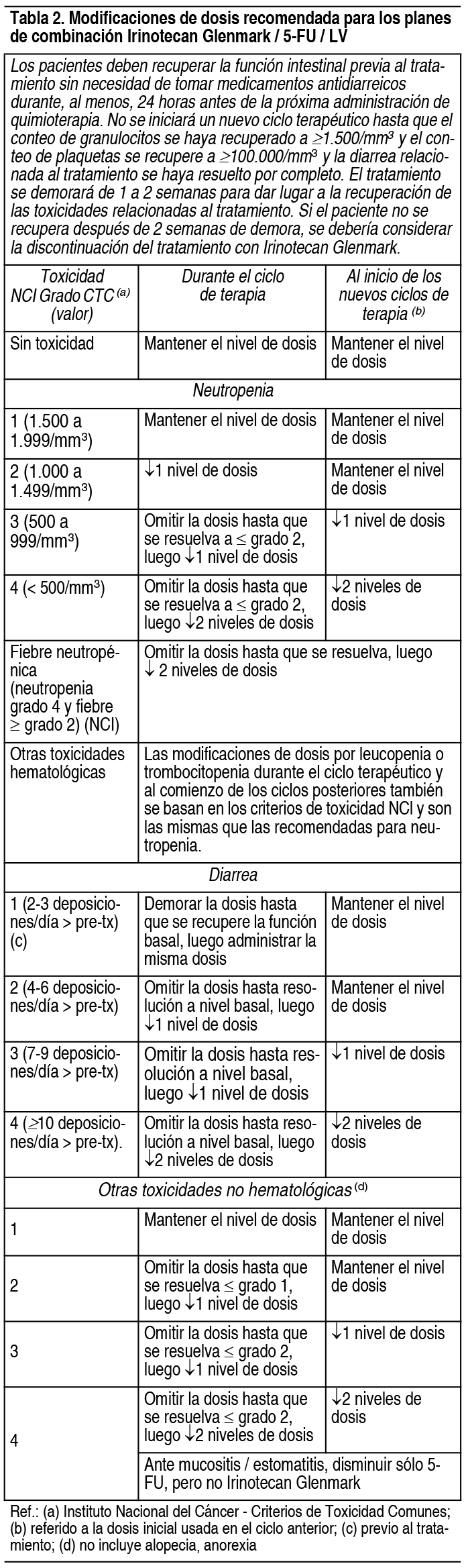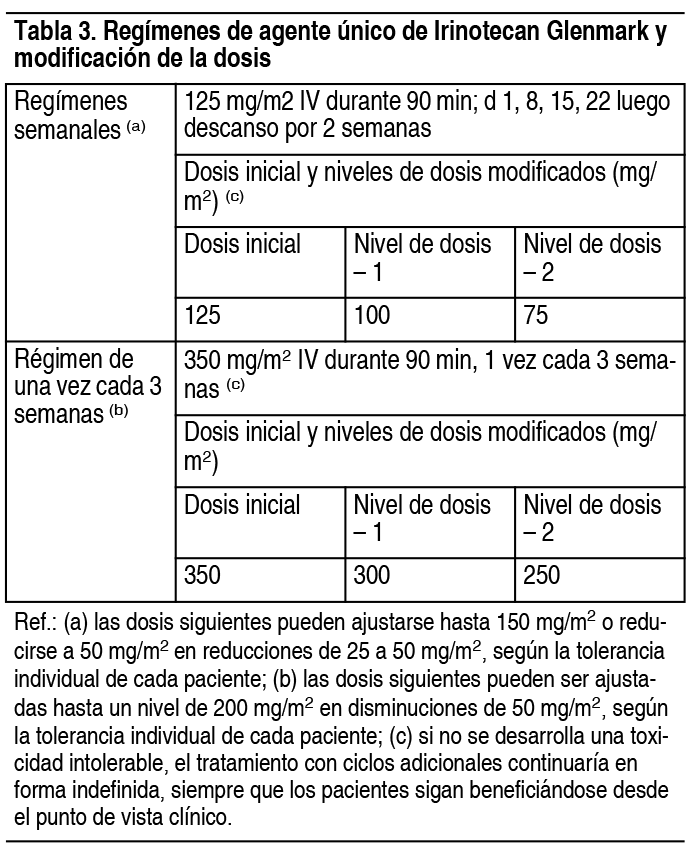 COMPOSICION: Solución Inyectable 100 mg: Cada frasco de solución inyectable contiene: Irinotecan 100 mg. ACCION: Antineoplásico. INDICACIONES: Irinotecan Glenmark, en combinación con 5-fluoruracilo (5-FU) y leucovorina (LV), está indicado como un componente de la primera línea de tratamiento para los pacientes con carcinoma metastásico de colon o recto. También podrá ser indicado en pacientes con enfermedad recurrente o progresiva después de haber recibido una terapia inicial con 5-FU. Irinotecan Glenmark, en combinación con cetuximab, está indicado para el tratamiento del cáncer colorrectal metastásico del tipo salvaje KRAS, que expresa el receptor del factor de crecimiento epidérmico (EGFR, por sus siglas en inglés) en pacientes que no hayan recibido tratamiento previo para la enfermedad metastásica o en quienes una terapia citotóxica que incluya irinotecan ha fracasado. Irinotecan Glenmark, en combinación con 5-FU, ácido folínico (AF) y bevacizumab, está indicado para el tratamiento de primera línea en pacientes con carcinoma metastásico de colon o recto. Irinotecan Glenmark, en combinación con capecitabina con o sin bevacizumab, está indicado para el tratamiento de primera línea en pacientes con carcinoma metastásico colorrectal. DOSIS: Todas las dosis de irinotecan se deben administrar como una infusión I.V. durante 90 minutos. Posología en pacientes con actividad reducida de la enzima UGT1A1: cuando Irinotecan Glenmark se administra en combinación con otros agentes o como agente único, se debe considerar una reducción de, al menos, un nivel de la dosis inicial de irinotecan en los pacientes conocidos como homocigotas para el alelo UGT1A128. Sin embargo, no se conoce la reducción de dosis precisa en esta población de pacientes, por lo que las modificaciones de dosis siguientes se deben basar en la tolerancia individual del paciente al tratamiento. Plan de dosis de Irinotecan Glenmark como combinación-agente: Regímenes de la dosis: Irinotecan Glenmark inyección en combinación con 5-fluorouracilo (5-FU) y leucovorina (LV): Irinotecan Glenmark debe administrarse como infusión I.V. durante 90 minutos. Para todos los regímenes, la dosis de LV se administrará inmediatamente después de Irinotecan Glenmark, donde la administración de 5-FU se producirá inmediatamente después de recibir LV. Irinotecan Glenmark se usará en la forma recomendada; los regímenes recomendados actualmente se indican en la tabla 2. La dosis para pacientes con bilirrubina > 2 mg/dl no pueden recomendarse, porque estos pacientes no se incluyeron en los ensayos clínicos. Se recomienda que los pacientes reciban medicación previa con agentes antieméticos. La administración profiláctica o terapéutica de atropina será considerada en pacientes que experimentan síntomas colinérgicos. Ver Tabla Irinotecan Glenmark en combinación con cetuximab: si desea conocer la posología y el método de administración de cetuximab, consulte la información para prescribir de dicho medicamento. Normalmente, se usa la misma dosis de Irinotecan Glenmark que se administró en los últimos ciclos de régimen anterior que contenía irinotecan. Irinotecan Glenmark no debe administrarse antes de pasada 1 hora de haber concluido la infusión de cetuximab. Irinotecan Glenmark en combinación con bevacizumab: si desea conocer la posología y el método de administración de bevacizumab, consulte la información para prescribir de dicho medicamento. El bevacizumab se recomienda en combinación con el irinotecan (125 mg/m2)/bolo de 5-FU (500 mg/m2)/ácido folínico (20 mg/m2), administrado 1 vez a la semana durante 4 semanas, cada 6 semanas. Irinotecan Glenmark en combinación con capecitabina: si desea conocer la posología y el método de administración de capecitabina, consulte la información para prescribir de dicho medicamento. La capecitabina está recomendada en combinación con el irinotecan en una dosis inicial de 1.000 mg/m2 por 2 semanas, cada 3 semanas. Modificaciones de la dosis: Los pacientes serán cuidadosamente controlados para determinar la toxicidad y las dosis de Irinotecan Glenmark y 5-FU serán modificadas según se requiera para adaptar la tolerancia individual del paciente al tratamiento. De acuerdo con los niveles de dosis recomendados descriptos en la tabla 1 (ver antes), las dosis posteriores serán ajustadas como se sugiere en la tabla 2. Las recomendaciones para la modificación de dosis de cetuximab o bevacizumab cuando se administra en combinación con Irinotecan Glenmark, se deben seguir conforme a la información de prescripción del respectivo medicamento. En combinación con capecitabina, para pacientes de 65 años o más, se recomienda una reducción de la dosis inicial de capecitabina a 800 mg/m2 2 veces por día según la información de prescripción para capecitabina. Refiérase también a las recomendaciones para las modificaciones de dosis en el régimen de combinación dado en la información de prescripción de capecitabina. Todas las modificaciones de dosis se basarán en la peor toxicidad precedente. No se iniciará un ciclo nuevo de terapia hasta que la toxicidad se haya recuperado a grado 1 o menor según la clasificación del Instituto Nacional del Cáncer (NCI). El tratamiento puede demorarse de 1 a 2 semanas, para permitir la recuperación de la toxicidad relacionada con el tratamiento. Si el paciente no se recuperó, se debería considerar la discontinuación de la terapia. En la medida que no se desarrolle la toxicidad no tolerada, el tratamiento con ciclos adicionales de Irinotecan Glenmark/5-FU/LV continuaría en forma indefinida mientras que los pacientes sigan experimentando un beneficio clínico. Ver Tabla Plan de dosis de Irinotecan Glenmark como agente único: Regímenes de la dosis: Irinotecan Glenmark se administra como una infusión I.V., durante 90 minutos, tanto para los planes de dosis semanales como de 1 vez cada 3 semanas. Ver