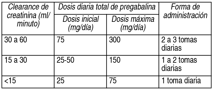 COMPOSICION: Cada comprimido birranurado contiene: Pregabalina 75.00 mg. ACCION: Antiepiléptico. Antineurálgico. INDICACIONES: Dolor neuropático asociado a neuropatía diabética periférica. Neuralgia postherpética. Adyuvante en pacientes adultos con convulsiones de inicio parcial. Fibromialgia. Aansiedad generalizada en adultos (según criterios DSM IV). Dolor neuropático post-injuria espinal. DOSIS: Un comprimido birranurado de 75 mg, puede fraccionarse en 3 fragmentos de 25 mg cada uno. La dosis diaria debe administrarse en 2 a 3 tomas diarias. Tratamiento del dolor neuropático asociado con neuropatía periférica diabética: Dosis inicial: 75 mg 2 veces al día ó 50 mg 3 veces al día. En función de la respuesta y tolerancia del paciente, la dosis podrá incrementarse, dentro de la primera semana, a 150 mg 2 veces al día ó 100 mg 3 veces al día. Dosis máxima recomendada: 300 mg/día. Tratamiento de la neuralgia postherpética: Dosis inicial: 75 mg 2 veces al día ó 50 mg 3 veces al día. En función de la respuesta y tolerancia del paciente, la dosis podrá incrementarse, dentro de la primera semana, hasta un máximo de 300 mg/día. La dosis recomendada es de 75-150 mg 2 veces al día ó 50-100 mg 3 veces al día (150 a 300 mg/día). En pacientes tratados con 300 mg/día que no experimenten un alivio suficiente del dolor luego de 2-4 semanas de tratamiento, la dosis podrá incrementarse a 600 mg/día (300 mg 2 veces al día ó 200 mg 3 veces al día). Dosis superiores a 300 mg/día deben reservarse para pacientes que presenten dolor persistente y una buena tolerancia a la dosis de 300 mg/día. Tratamiento adyuvante en pacientes adultos con convulsiones de inicio parcial: El rango de dosis recomendado es de 150 a 600 mg/día, en 2 ó 3 tomas diarias. Dosis inicial: 75 mg 2 veces al día ó 50 mg 3 veces al día. En función de la respuesta y tolerancia del paciente, la dosis podrá incrementarse, a intervalos semanales, a 300 mg/día y posteriormente a 600 mg/día. Dosis máxima recomendada: 600 mg/día. Tratamiento de la fibromialgia: El rango de dosis recomendado es de 300 a 450 mg/día, en 2 ó 3 tomas diarias. Dosis inicial: 75 mg 2 veces al día. En función de la respuesta y tolerancia del paciente, la dosis podrá incrementarse, a intervalos semanales, a 300 mg/día, y posteriormente a 450 mg/día. Dosis máxima recomendada: 450 mg/día. Tratamiento de la ansiedad generalizada en adultos: Dosis inicial: 75 mg 2 veces al día ó 50 mg 3 veces al día. En función de la respuesta y tolerancia del paciente, la dosis podrá incrementarse, a intervalos semanales, a 300 mg/día, seguidamente a 450 mg/día y posteriormente a 600 mg/día, en 2 ó 3 tomas diarias. La necesidad de continuar con el tratamiento deberá reevaluarse periódicamente. Dosis máxima recomendada: 600 mg/día. Tratamiento del dolor neuropático post-injuria espinal: Dosis inicial: 75 mg 2 veces al día ó 50 mg 3 veces al día. En función de la respuesta y tolerabilidad del paciente, la dosis podrá incrementarse, dentro de la primera semana, a 150 mg 2 veces al día ó 100 mg 3 veces al día. En pacientes tratados con 300 mg/día que no experimenten un alivio suficiente del dolor luego de 2-3 semanas de tratamiento, la dosis podrá incrementarse a 600 mg/día (300 mg 2 veces al día o 200 mg 3 veces al día). Situaciones clínicas particulares: Insuficiencia renal: la siguiente tabla presenta las dosis sugeridas en pacientes con alteración de la función renal. Ver Tabla El clearance de creatinina puede ser estimado usando la ecuación de Cockcroft y Gault: Ver Tabla Dosis complementaria luego de la hemodiálisis: Además de la dosis diaria de pregabalina, luego de cada sesión de 4 horas de hemodiálisis debe administrarse una dosis complementaria de inmediato: Ver Tabla Insuficiencia hepática: no se requiere un ajuste de dosis. Pacientes pediátricos: la seguridad y la eficacia de pregabalina en niños menores de 12 años y adolescentes (12-17 años) no han sido establecidas. Pacientes geriátricos: dado que los pacientes ancianos son más propensos a desarrollar insuficiencia renal, se recomienda precaución durante la selección de la dosis y un ajuste de la misma en función del clearance de creatinina. Modo de administración: El producto puede administrarse con o fuera de las comidas. PRESENTACIONES: Envase conteniendo 30 comprimidos birranurados. |