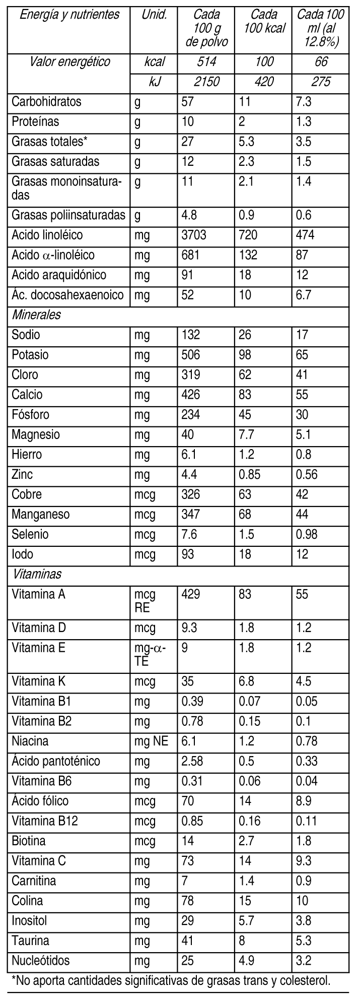 COMPOSICION: Ver Tabla Contiene: Maltodextrina, Caseinato de Calcio, Aceites Vegetales (Palma, Canola, Coco, Girasol Alto Oleico, Girasol), Jarabe de Glucosa, Citrato de Potasio, Fosfato Tricálcico (E341iii), Fosfato Dipotásico (E340ii), Cloruro de Potasio, Citrato de Sodio, Aceites de Células Simples, Carbonato de Calcio, Aceite de Pescado, Cloruro de Magnesio, Lecitina (E322), Ascorbato de Sodio (E301), Cloruro de Colina, Ácido Cítrico, L- Cistina, Ácido Ascórbico, Taurina, Hidróxido de Potasio, L-Triptofano, Inositol, Sulfato Ferrroso, Mezcla de Tocoferoles (E306), Proteína de Suero, Mono y Diglicéridos (E471), Sulfato de Zinc, Nucleótidos (Uridina, Citidina, Adenosina, Inosina, Guanosina), L-Carnitina, Palmitato de Ascorbilo (E304i), Acetato de DL-α-Tocoferol, Niacinamida, D-Pantotenato de Calcio, Sulfato de Manganeso, Gluconato Cúprico, Riboflavina, DL-α-Tocoferol, Acetato de Retinol, Hidroclorhidrato de Tiamina, Hidroclorhidrato de Piridoxina, Iodato de Potasio, Ácido Fólico, Fitomenadiona, Biotina, Colecalciferol, Selenito de Sodio, Cianocobalamina. DESCRIPCIONES: Alimento para propósitos médicos específicos, sin lactosa, con hierro, ácidos grasos poliinsaturados de cadena larga y nucleótidos, para lactantes. Libre de gluten. ACCION: Fórmula láctea para propósitos médicos específicos, sin lactosa. INDICACIONES: Alimento para propósitos médicos específicos, para lactantes y niños con intolerancia a la lactosa, temporal o congénita, contribuyendo al mantenimiento y la recuperación de la integridad de la mucosa intestinal. DOSIS: Dilución al 12.8%. Medida al ras: 4.3 g. PRESENTACIONES: Lata herméticamente sellada conteniendo 400 g, con sistema easy-open y tapa plástica de seguridad. |