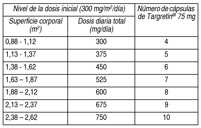 COMPOSICION: Las cápsulas de Targretin®, contienen Bexaroteno, un miembro de la familia de los retinoides que está asociado con defectos de nacimiento. Targretin® cápsulas no debe administrarse a mujeres embarazadas. ACCION: Antineoplásico. INDICACIONES: Targretin® está indicado en el tratamiento de las manifestaciones cutáneas de pacientes en estadios avanzados de linfoma cutáneo de células T (LCCT) en pacientes adultos resistentes, al menos, a un tratamiento sistémico. DOSIS: El tratamiento con bexaroteno será iniciado y mantenido únicamente por médicos con experiencia en el tratamiento de pacientes con LCCT. Posología: La dosis inicial recomendada es de 300 mg/m2/día. Los cálculos de la dosis inicial conforme al área de superficie corporal son los siguientes: Dosis inicial recomendada: Ver Tabla Directrices para modificar la dosis: El nivel de dosificación de 300 mg/m2/día podrá modificarse a 200 mg/m2/día, luego a 100 mg/m2/día o incluso suspenderse temporalmente, si es necesario debido a la aparición de la toxicidad. Una vez controlada la toxicidad, las dosis podrán modificarse de nuevo con cuidado de manera ascendente. Con una supervisión clínica apropiada, algunos pacientes podrán beneficiarse de dosis superiores a 300 mg/m2/día. No se han evaluado dosis superiores a 650 mg/m2/día en pacientes con LCCT. En ensayos clínicos, se administró bexaroteno hasta un máximo de 118 semanas a pacientes con LCCT. El tratamiento se prolongará mientras beneficie al paciente. Los clínicos indican que la eliminación urinaria del bexaroteno y sus metabolitos es una ruta de excreción menos importante para el bexaroteno. En todos los pacientes evaluados, el aclaramiento renal calculado de bexaroteno fue de menos de 1 ml/minuto. En vista de los datos limitados, se vigilará muy de cerca a los pacientes con insuficiencia renal mientras reciben el tratamiento de bexaroteno. Forma de administración: Para administración por vía oral. Las cápsulas de Targretin® se deben tomar en dosis única oral diaria con una comida. La cápsula no se debe masticar. PRESENTACIONES: Envase conteniendo 100 cápsulas blandas. |