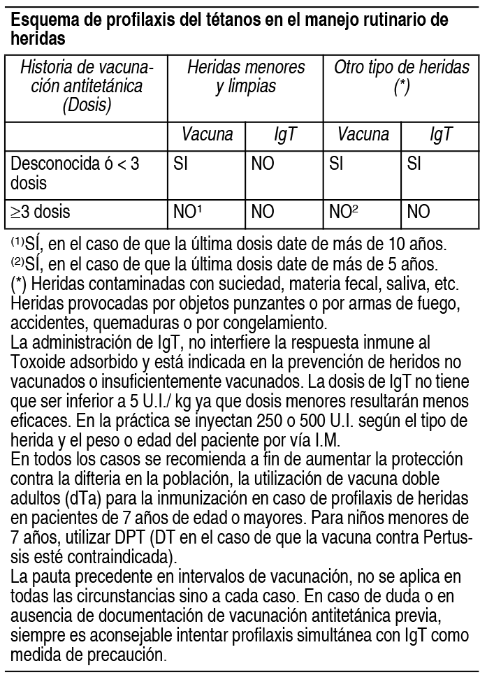 COMPOSICION: Componente activo: Gammaglobulina Hiperinmune Antitetánica 500 UI. Cada ampolla de 0.5 ml contiene: Toxoide Tetánico 75 UI. ACCION: Información aplicable a gammaglobulina hiperinmune antitetánica solamente: Inmunoterapia antitetánica pasiva. Información correspondiente al toxoide tetánico solamente: Inmunización activa contra el tétanos. INDICACIONES: Información aplicable a Gammaglobulina hiperinmune antitetánica solamente: Profilaxis luego de la exposición: Profilaxis inmediata luego de lesiones tetanígenas en pacientes: que no están inmunizados en forma adecuada. Cuyo estado de inmunización no se conoce con certeza, con deficiencia severa en la producción de anticuerpos. Tratamiento del tétanos clínicamente manifiesto: La inmunoglobulina antitetánica debe administrarse siempre en conjunto con toxoide tetánico a menos que existan contraindicaciones o confirmación de inmunización adecuada. Deben observarse los lineamientos de la OMS y otras guías oficiales acerca del uso de inmunoglobulina antitetánica humana para uso I.M. Información correspondiente al toxoide tetánico solamente: Inmunización activa contra el tétanos en infantes a partir del segundo mes, niños, adolescentes y adultos. Profilaxis del tétanos en caso de lesión. Pacientes recuperados de una infección tetánica. Prevención del tétanos neonatal en mujeres embarazadas. Prevención del tétanos por riesgo quirúrgico. DOSIS: Información aplicable a gammaglobulina hiperinmune antitetánica solamente: Profilaxis ante heridas tetanígenas: 250 UI a menos que se considere que el riesgo es extremadamente alto. La dosis puede incrementarse a 500 UI en caso de: heridas infectadas en las que no puede lograrse un tratamiento quirúrgico apropiado dentro de las 24 horas. Heridas profundas o contaminadas con daño tisular y aporte reducido de oxígeno, así como lesiones por cuerpos extraños (por ej.: mordeduras, picaduras o inyecciones). Quemaduras, congelamientos. Necrosis tisular. Aborto septicémico. Adultos con peso superior al promedio. En caso de quemaduras extensas, se recomienda administrar una segunda inyección de 250 UI de Inmunoglobulina Antitetánica luego de que la fase exudativa de la quemadura haya finalizado (alrededor de 36 horas luego del inicio de la quemadura). Tratamiento del tétanos clínicamente manifiesto: Dosis únicas de 3.000 a 6.000 UI (combinadas con otros procedimientos clínicos apropiados). En cuanto a la frecuencia, intervalo de inyecciones y duración del tratamiento, las dosis repetidas dependen del cuadro clínico. Información correspondiente al toxoide tetánico solamente: Administración I.M. profunda. Agitar antes de su aplicación. Antes de la inyección el sitio debe limpiarse con un antiséptico conveniente. Luego de la inserción de la aguja se debe aspirar para evitar la inyección inadvertida en un vaso sanguíneo. El producto no debe administrarse por vía I.V. La dosificación es la misma para infantes de 2 meses de edad en adelante, niños, adolescentes y adultos. Inmunización de base y refuerzos: Inmunización de base: Se aplicarán 3 dosis de 0.5 ml. por vía I.M., las 2 primeras con un intervalo no menor de 4 semanas y la tercera 1 año después de aplicada la segunda dosis. En caso de interrumpirse el esquema, se continuará con las dosis faltantes, no siendo necesario iniciar la serie nuevamente. Refuerzos: Se recomiendan vacunaciones de refuerzo en personas adultas cada 10 años administrando 1 dosis de 0.5 ml por vía I.M. Profilaxis del tétanos en personas lesionadas: La necesidad de inmunización activa contra el tétanos con o sin inmunización pasiva con inmunoglobulina humana antitetánica (IgT) depende de las condiciones de la herida y de la historia de inmunización del paciente. Personas lesionadas que han recibido el esquema básico de vacunación del tétanos que presentan heridas menores y no contaminadas: Sólo deben recibir un refuerzo en el caso de que el último date de más de 10 años. Personas lesionadas que han recibido el esquema básico de vacunación del tétanos que presentan heridas de consideración: Deben recibir un refuerzo si el último data de más de 5 años. Personas lesionadas parcialmente protegidas contra el tétanos: Se debe asegurar que se complete el esquema de inmunización primaria. Además, si los pacientes poseen una herida potencialmente tetanígena, se recomienda el uso de IgT conjuntamente de acuerdo al siguiente esquema: (la IgT, debe ser aplicada con jeringa y en un sitio de administración separado). Ver Tabla Profilaxis simultánea en personas lastimadas con inmunodeficiencia conocida o sometida a terapia inmunosupresiva: Por su baja capacidad de producción de anticuerpos, es necesario administrar conjuntamente IgT como medida precautoria. Pacientes recuperados de una infección tetánica: La infección tetánica puede no conferir inmunidad, por lo tanto, se debe completar la inmunización activa en pacientes que se hayan recuperado de esta infección, de acuerdo al esquema básico de inmunización y refuerzos. Profilaxis del tétanos neonatal en mujeres embarazadas: Las mujeres embarazadas y madres que amamantan deben recibir el esquema de vacunación básica o de refuerzo, de manera que los niveles de anticuerpos de la madre sean tan altos como sea posible al momento del nacimiento. Las mujeres embarazadas que no han sido inmunizadas previamente deben recibir las 2 primeras dosis antes del nacimiento, preferentemente en el 5º y 7º mes de gestación. Profilaxis del tétanos por riesgo quirúrgico: Es aconsejable la aplicación de una dosis con 10 a 15 días de anticipación a toda intervención quirúrgica si no se tiene la seguridad de que el paciente tenga completado el esquema vacunatorio dentro de los últimos 10 años. PRESENTACIONES: Caja conteniendo 1 jeringa precargada de 2 ml correspondiente a 500 UI de gammaglobulina antitetánica hiperinmune + 1 ampolla de 0.5 ml cor