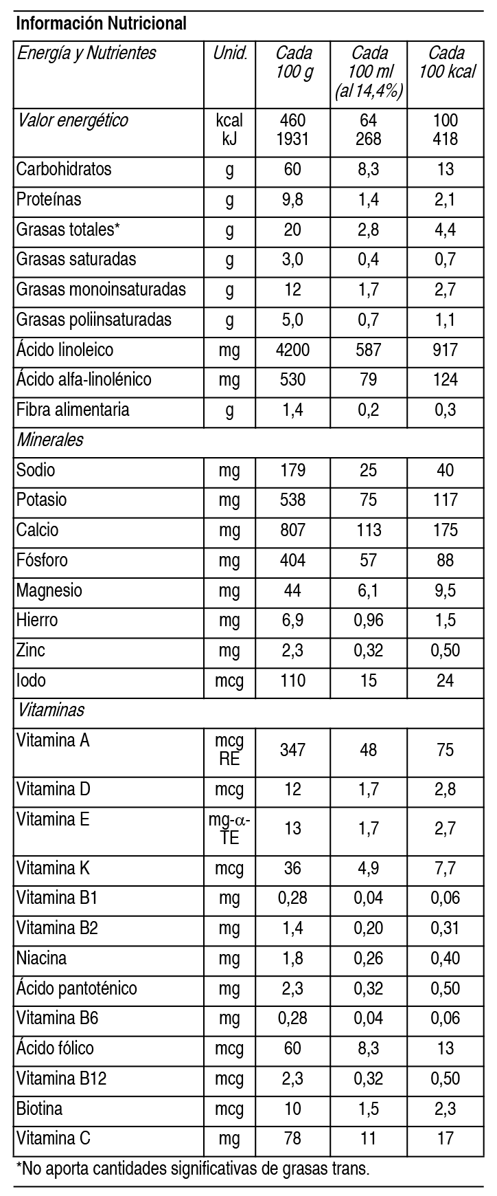 COMPOSICION: Contiene: Lactosa, Aceites Vegetales (Aceite de: Canola, Girasol Alto Oleico, Girasol, Palma), Sólidos de Leche Descremada, Proteínas de Suero, Galacto-oligosacáridos, Fosfato Dibásico de Calcio, Carbonato de Calcio, Cloruro de Potasio, Fructo-oligosacáridos, Citrato de Sodio, Acido Ascórbico, Carbonado Dibásico de Magnesio, Sulfato de Hierro, Acetato de DL-Alfa tocoferol, Sulfato de Zinc, Lecitina Soja, Nicotinamida, Pantotenato de Calcio, Riboflavina, Palmitato de Retinol, DL-Alfa tocoferol, Clorhidrato de Tiamina, Clorhidrato de Piridoxina, Ioduro de Potasio, Acido Fólico, Fitomenadiona, Colecalciferol, Biotina, Cianocobalamina. ARO: Vainilla. Contiene Leche y Derivados de Soja. Puede contener Derivados de Pescado. Información Nutricional: Ver Tabla INDICACIONES: Leche modificada en polvo, para niños después del año. Fortificada con hierro y zinc. Libre de gluten. Sin T.A.C.C. PRESENTACIONES: Envase conteniendo 375 g. |