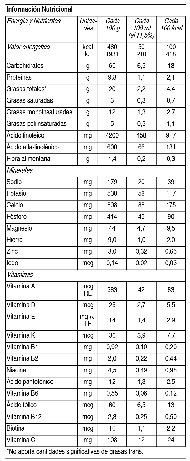 COMPOSICION: Contiene: Lactosa, Aceites Vegetales (Aceite de: Canola, Girasol Alto Oleico, Girasol, Palma), Sólidos de Leche Descremada, Proteína de Suero, Galactooligosacáridos, Fosfato Dibásico de Calcio, Carbonato de Calcio, Cloruro de Potasio, Fructo-oligosacáridos, Citrato de Sodio, Acido Ascórbico, Sulfato de Hierro, Carbonato Dibásico de Magnesio, Pantotenato de Calcio, Acetato de DL-Alfa tocoferol, Sulfato de Zinc, Nicotinamida, Lecitina de Soja, Riboflavina, Clorhidrato de Tiamina, Palmitato de Retinilo, DL-Alfa tocoferol, Clorhidrato de Piridoxina, Ioduro de Potasio, Acido Fólico, Fitomenadiona, Colecalciferol, Biotina, Cianocobalamina. ARO: vainilla. Contiene Leche y Derivados de Soja. Información Nutricional: Ver Tabla Un vaso de Vital Vitamina C aporta el 80% de la recomendación diaria. INDICACIONES: Leche modificada en polvo, para niños a partir de los 2 años. Fortificada con vitamina C. Libre de gluten. Sin T.A.C.C. PRESENTACIONES: Envase conteniendo 800 g. |