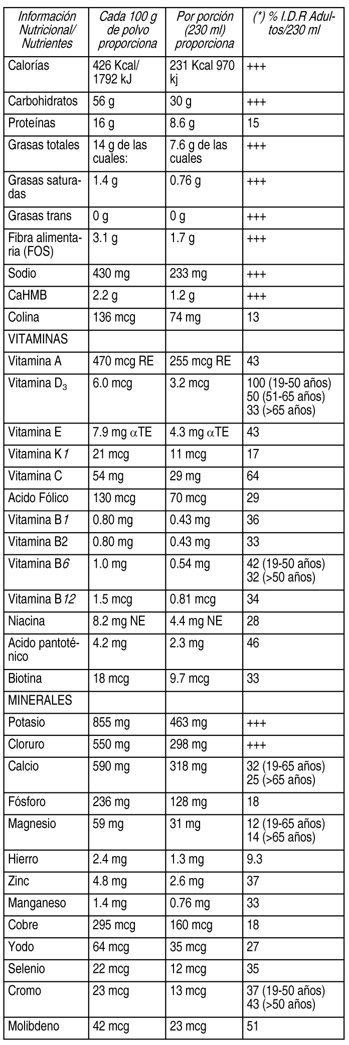 COMPOSICION: Contiene: Maltodextrina, Sacarosa, Aceites Vegetales (Aceite de Girasol de Alto Contenido Oleico, Aceite de Soja, Aceite de Canola), Caseinato de Calcio, Aislado de Proteína de Soja, Minerales (Citrato de Potasio, Citrato de Sodio, Cloruro de Potasio, Cloruro de Magnesio, Fosfato de Sodio, Hidróxido de Potasio, Cloruro de Sodio, Fosfato de Potasio, Sulfato Ferroso, Sulfato de Zinc, Sulfato de Manganeso, Sulfato Cúprico, Cloruro de Cromo, Molibdato de Sodio, Ioduro de Potasio, Selenito de Sodio), Fructoligosacáridos, Beta-hidroxi beta-metilbutirato de Calcio, Vitaminas (Cloruro de Colina, Acido Ascórbico, Palmitato de Ascorbilo, Mezcla de Tocoferoles, Niacinamida, d-Pantotenato de Calcio, dl-Alfa Tocoferil Acetato, Clorhidrato de Piridoxina, Clorhidrato de Tiamina, Rivoflavina, Palmitato de Vitamina A, Betacaroteno, Acido Fólico, d-Biotina, Vitamina K, [Filoquinona], Vitamina D3 [Colecalciferol], Cianocobalamina), Saborizante. Contiene Derivados de Leche y Derivados de Soja. Ver Tabla ACCION: Ensure® Advance proporciona una nutrición completa y balanceada para satisfacer las necesidades nutricionales de los adultos y ayudar a la salud. Ensure® Advance es una fuente de calcio y vitamina D y además contiene FOS (fructoligosacáridos). Ahora formulado con Nutrivigor®. Ensure® Advance es el único producto con Nutrivigor®. Nutrivigor®; es una combinación exclusiva de vitamina D, proteína y CaHMB para apoyar: Un estilo de vida activo. El CaHMB es un metabolito del aminoácido leucina, que es producido en forma natural por el organismo y se encuentra en pequeñas cantidades en algunos alimentos. Ensure® Advance es una fórmula nutricional en polvo, que una vez preparada con agua proporciona una nutrición completa y balanceada. INDICACIONES: Suplemento dietario en polvo para preparar bebida a base de carbohidratos, proteínas, lípidos, fibra, vitaminas y minerales, sabor vainilla. Libre de gluten, sin T.A.C.C. DOSIS: Ingesta diaria recomendada: 2 porciones de aproximadamente 230 ml o según consejo médico/nutricionista. PRESENTACIONES: Envase conteniendo 400 g y 850 g. |