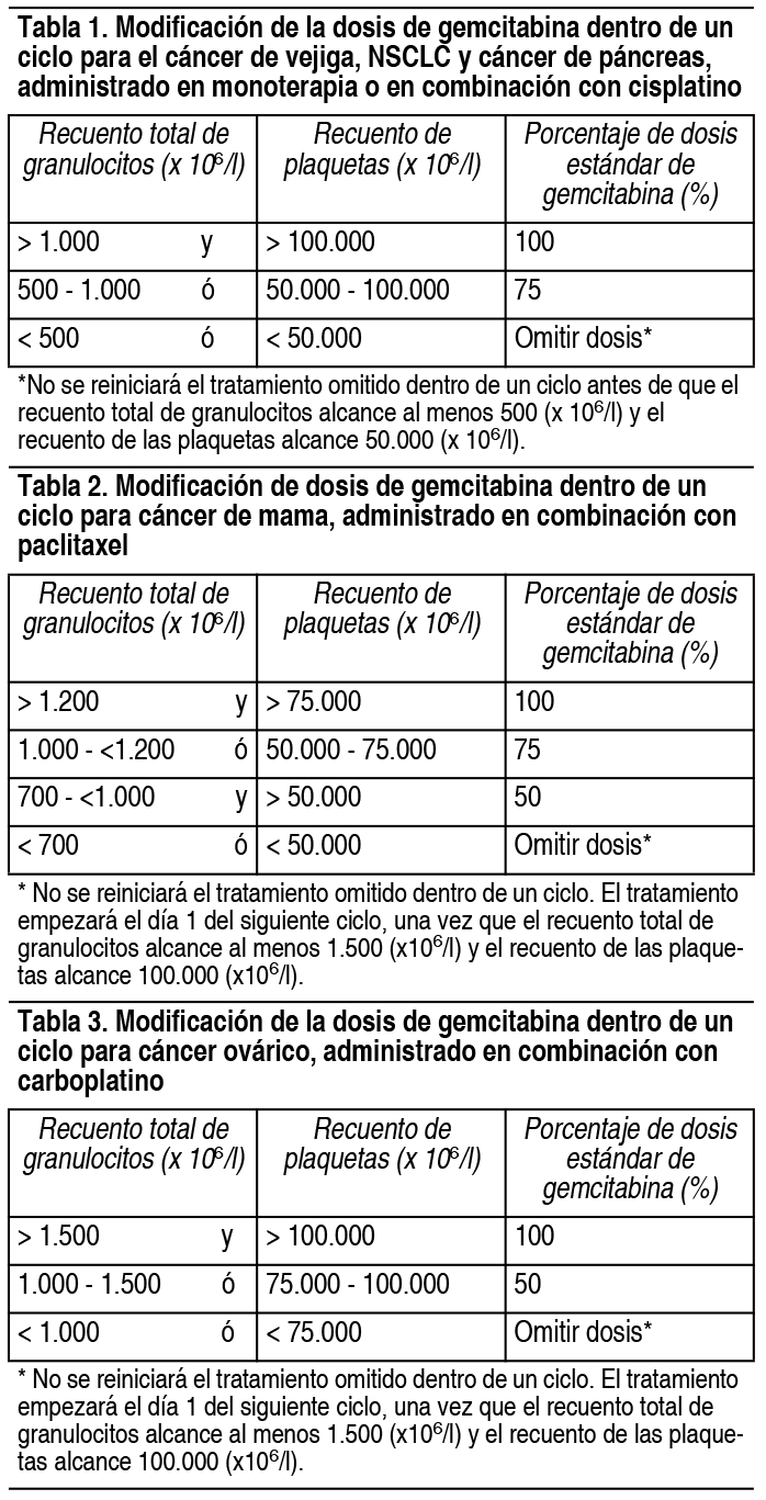 COMPOSICION: Inyectable 200 mg: Cada frasco-ampolla liofilizado contiene: Gemcitabina 200 mg. Inyectable 1 g: Cada frasco-ampolla liofilizado contiene: Gemcitabina 1 g. ACCION: Antineoplásico. INDICACIONES: Gemcitabina está indicada en el tratamiento de cáncer de vejiga localmente avanzado o metastático, en combinación con cisplatino. Gemcitabina está indicada en el tratamiento de pacientes con adenocarcinoma localmente avanzado o metastático del páncreas. Gemcitabina, en combinación con cisplatino, está indicada como tratamiento de primera línea de pacientes con cáncer de pulmón no microcítico (CPNM) localmente avanzado o metastático. Se puede considerar monoterapia con Gemcitabina en pacientes mayores o en aquéllos con un "performance status" de 2. Gemcitabina, en combinación con carboplatino, está indicada en el tratamiento de pacientes con carcinoma epitelial de ovario localmente avanzado o metastático con enfermedad recurrente, después de un intervalo libre de recidivas de al menos 6 meses después de un tratamiento de primera línea basado en un platino. Gemcitabina, en combinación con paclitaxel, está indicada en el tratamiento de pacientes con cáncer de mama metastático o localmente avanzado, no resecable, siempre que estos pacientes hayan recurrido tras un tratamiento quimioterapéutico previo adyuvante o neoadyuvante. El tratamiento quimioterapéutico previo deberá haber contenido una antraciclina a no ser que ésta estuviera clínicamente contraindicada. DOSIS: Gemcitabina sólo podrá ser prescrita por un especialista con experiencia en terapia antineoplásica: Cáncer de vejiga: Administración en combinación: Se recomienda una dosis de gemcitabina de 1000 mg/m2, administrada en infusión I.V. de 30 minutos. Dicha dosis deberá ser administrada los días primero, octavo y decimoquinto (1, 8 y 15) de cada ciclo de 28 días en combinación con cisplatino. La dosis recomendada de cisplatino es de 70 mg/m2 administrada el día primero, a continuación de la gemcitabina, o el día segundo de cada ciclo de 28 días. Este ciclo se repetirá cada 4 semanas. La reducción de la dosis durante un ciclo o en cada ciclo nuevo se realiza según el grado de toxicidad experimentado por el paciente. Cáncer de páncreas: La dosis recomendada de gemcitabina es de 1000 mg/m2, administrados en infusión I.V. de 30 minutos. Esta dosis se administrará semanalmente durante 7 semanas seguidas de 1 semana de descanso. Los ciclos siguientes serán de administración semanal durante 3 semanas consecutivas seguidas de 1 semana de descanso. La reducción de la dosis durante un ciclo o en cada ciclo nuevo se realiza según el grado de toxicidad experimentado por el paciente. Cáncer de pulmón no microcítico: Administración en monoterapia: La dosis recomendada de gemcitabina es de 1000 mg/m2, administrados en infusión I.V. de 30 minutos. Esta dosis se administrará semanalmente durante 3 semanas, seguidas de 1 semana de descanso. Este ciclo se repetirá cada 4 semanas. La reducción de la dosis durante un ciclo o en cada ciclo nuevo se realiza según el grado de toxicidad experimentado por el paciente. Administración en combinación: Se recomienda una dosis de gemcitabina de 1250 mg/m2 de superficie corporal, administrados en infusión intravenosa de 30 minutos, los días primero y octavo (1 y 8) de cada ciclo de 21 días. La reducción de la dosis durante un ciclo o en cada ciclo nuevo se realiza según el grado de toxicidad experimentado por el paciente. Se ha utilizado cisplatino en dosis entre 75-100 mg/m2 una vez cada 3 semanas. Cáncer de mama: Administración en combinación: Se recomienda la administración de gemcitabina en combinación con paclitaxel, administrando en primer lugar paclitaxel (175 mg/m2), el día 1 del ciclo, en infusión I.V. de aproximadamente 3 horas, seguido por gemcitabina (1250 mg/m2), administrada en infusión I.V. de 30 minutos, los días primero y octavo (días 1 y 8) de cada ciclo de 21 días. La reducción de la dosis durante un ciclo o en cada ciclo nuevo se realiza según el grado de toxicidad experimentado por el paciente. Los pacientes deberán tener un recuento absoluto de granulocitos de al menos 1.500 x 106/l antes de iniciar un nuevo ciclo de gemcitabina en combinación con paclitaxel. Cáncer de ovario: Administración en combinación: Se recomienda una dosis de gemcitabina de 1000 mg/m2 administrada en infusión I.V. de 30 minutos los días primero y octavo (días 1 y 8) de cada ciclo de 21 días. Carboplatino se administrará después de gemcitabina el día primero (día 1) a una dosis tal que el Área Bajo la Curva (AUC) sea de 4.0 mg/ml·min. La reducción de la dosis durante un ciclo o en cada ciclo nuevo se realiza según el grado de toxicidad experimentado por el paciente. Monitorización y modificación de la dosis en función de la toxicidad: Modificación de la dosis en función de la toxicidad no hematológica: Se deben realizar exámenes físicos periódicos así como chequeos de la función renal y hepática para detectar toxicidad no hematológica. La reducción de la dosis durante un ciclo o en cada ciclo nuevo puede realizarse según el grado de toxicidad experimentado por el paciente. En general, para una toxicidad no hematológica grave (Grado 3 ó 4), excepto náuseas/vómitos, se debe suspender o reducir el tratamiento con gemcitabina dependiendo de la opinión del médico a cargo del tratamiento, hasta que la toxicidad se haya resuelto. Cuando se ajusta la dosis de cisplatino, carboplatino y paclitaxel en caso de terapia combinada, consulte el prospecto para el profesional correspondiente. Modificación de la dosis en función de la toxicidad hematológica: Inicio de un ciclo: Para todas las indicaciones, los pacientes deben ser monitorizados antes de cada dosis para un recuento de plaquetas y de granulocitos. Los pacientes deben tener un recuento total de granulocitos de al menos 1.500 (x 106/l) y un recuen