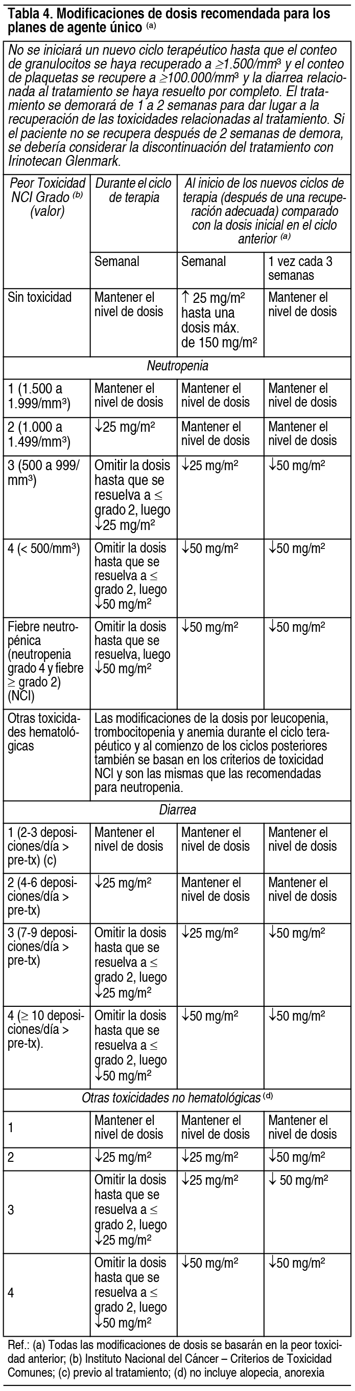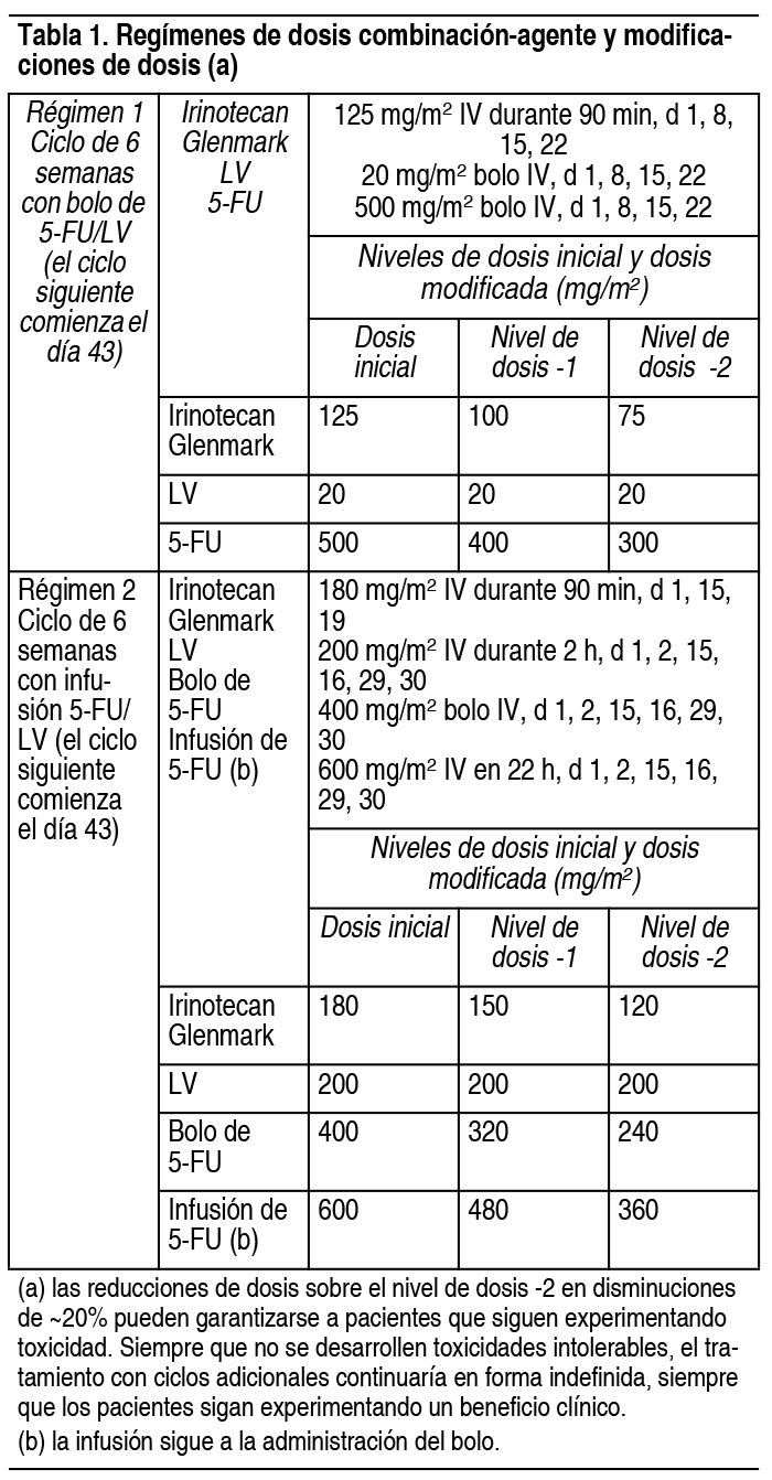 COMPOSICION: Solución Inyectable 100 mg: Cada frasco de solución inyectable contiene: Irinotecan 100 mg. ACCION: Antineoplásico. INDICACIONES: Irinotecan Glenmark, en combinación con 5-fluoruracilo (5-FU) y leucovorina (LV), está indicado como un componente de la primera línea de tratamiento para los pacientes con carcinoma metastásico de colon o recto. También podrá ser indicado en pacientes con enfermedad recurrente o progresiva después de haber recibido una terapia inicial con 5-FU. Irinotecan Glenmark, en combinación con cetuximab, está indicado para el tratamiento del cáncer colorrectal metastásico del tipo salvaje KRAS, que expresa el receptor del factor de crecimiento epidérmico (EGFR, por sus siglas en inglés) en pacientes que no hayan recibido tratamiento previo para la enfermedad metastásica o en quienes una terapia citotóxica que incluya irinotecan ha fracasado. Irinotecan Glenmark, en combinación con 5-FU, ácido folínico (AF) y bevacizumab, está indicado para el tratamiento de primera línea en pacientes con carcinoma metastásico de colon o recto. Irinotecan Glenmark, en combinación con capecitabina con o sin bevacizumab, está indicado para el tratamiento de primera línea en pacientes con carcinoma metastásico colorrectal. DOSIS: Todas las dosis de irinotecan se deben administrar como una infusión I.V. durante 90 minutos. Posología en pacientes con actividad reducida de la enzima UGT1A1: cuando Irinotecan Glenmark se administra en combinación con otros agentes o como agente único, se debe considerar una reducción de, al menos, un nivel de la dosis inicial de irinotecan en los pacientes conocidos como homocigotas para el alelo UGT1A128. Sin embargo, no se conoce la reducción de dosis precisa en esta población de pacientes, por lo que las modificaciones de dosis siguientes se deben basar en la tolerancia individual del paciente al tratamiento. Plan de dosis de Irinotecan Glenmark como combinación-agente: Regímenes de la dosis: Irinotecan Glenmark inyección en combinación con 5-fluorouracilo (5-FU) y leucovorina (LV): Irinotecan Glenmark debe administrarse como infusión I.V. durante 90 minutos. Para todos los regímenes, la dosis de LV se administrará inmediatamente después de Irinotecan Glenmark, donde la administración de 5-FU se producirá inmediatamente después de recibir LV. Irinotecan Glenmark se usará en la forma recomendada; los regímenes recomendados actualmente se indican en la tabla 2. La dosis para pacientes con bilirrubina > 2 mg/dl no pueden recomendarse, porque estos pacientes no se incluyeron en los ensayos clínicos. Se recomienda que los pacientes reciban medicación previa con agentes antieméticos. La administración profiláctica o terapéutica de atropina será considerada en pacientes que experimentan síntomas colinérgicos. Ver Tabla Irinotecan Glenmark en combinación con cetuximab: si desea conocer la posología y el método de administración de cetuximab, consulte la información para prescribir de dicho medicamento. Normalmente, se usa la misma dosis de Irinotecan Glenmark que se administró en los últimos ciclos de régimen anterior que contenía irinotecan. Irinotecan Glenmark no debe administrarse antes de pasada 1 hora de haber concluido la infusión de cetuximab. Irinotecan Glenmark en combinación con bevacizumab: si desea conocer la posología y el método de administración de bevacizumab, consulte la información para prescribir de dicho medicamento. El bevacizumab se recomienda en combinación con el irinotecan (125 mg/m2)/bolo de 5-FU (500 mg/m2)/ácido folínico (20 mg/m2), administrado 1 vez a la semana durante 4 semanas, cada 6 semanas. Irinotecan Glenmark en combinación con capecitabina: si desea conocer la posología y el método de administración de capecitabina, consulte la información para prescribir de dicho medicamento. La capecitabina está recomendada en combinación con el irinotecan en una dosis inicial de 1.000 mg/m2 por 2 semanas, cada 3 semanas. Modificaciones de la dosis: Los pacientes serán cuidadosamente controlados para determinar la toxicidad y las dosis de Irinotecan Glenmark y 5-FU serán modificadas según se requiera para adaptar la tolerancia individual del paciente al tratamiento. De acuerdo con los niveles de dosis recomendados descriptos en la tabla 1 (ver antes), las dosis posteriores serán ajustadas como se sugiere en la tabla 2. Las recomendaciones para la modificación de dosis de cetuximab o bevacizumab cuando se administra en combinación con Irinotecan Glenmark, se deben seguir conforme a la información de prescripción del respectivo medicamento. En combinación con capecitabina, para pacientes de 65 años o más, se recomienda una reducción de la dosis inicial de capecitabina a 800 mg/m2 2 veces por día según la información de prescripción para capecitabina. Refiérase también a las recomendaciones para las modificaciones de dosis en el régimen de combinación dado en la información de prescripción de capecitabina. Todas las modificaciones de dosis se basarán en la peor toxicidad precedente. No se iniciará un ciclo nuevo de terapia hasta que la toxicidad se haya recuperado a grado 1 o menor según la clasificación del Instituto Nacional del Cáncer (NCI). El tratamiento puede demorarse de 1 a 2 semanas, para permitir la recuperación de la toxicidad relacionada con el tratamiento. Si el paciente no se recuperó, se debería considerar la discontinuación de la terapia. En la medida que no se desarrolle la toxicidad no tolerada, el tratamiento con ciclos adicionales de Irinotecan Glenmark/5-FU/LV continuaría en forma indefinida mientras que los pacientes sigan experimentando un beneficio clínico. Ver Tabla Plan de dosis de Irinotecan Glenmark como agente único: Regímenes de la dosis: Irinotecan Glenmark se administra como una infusión I.V., durante 90 minutos, tanto para los planes de dosis semanales como de 1 vez cada 3 semanas. Ver